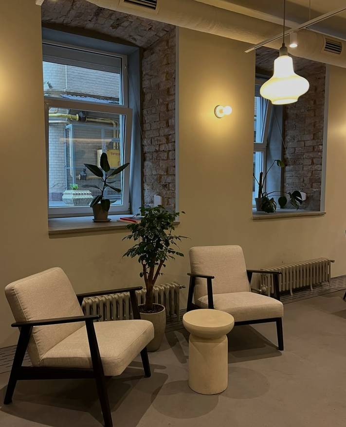 Заклад має декілька зон: куточки для компанії, місця для фокусованої роботи. Також є тихий дворик, що дає змогу залишатися в центрі міста, але без міського шуму.