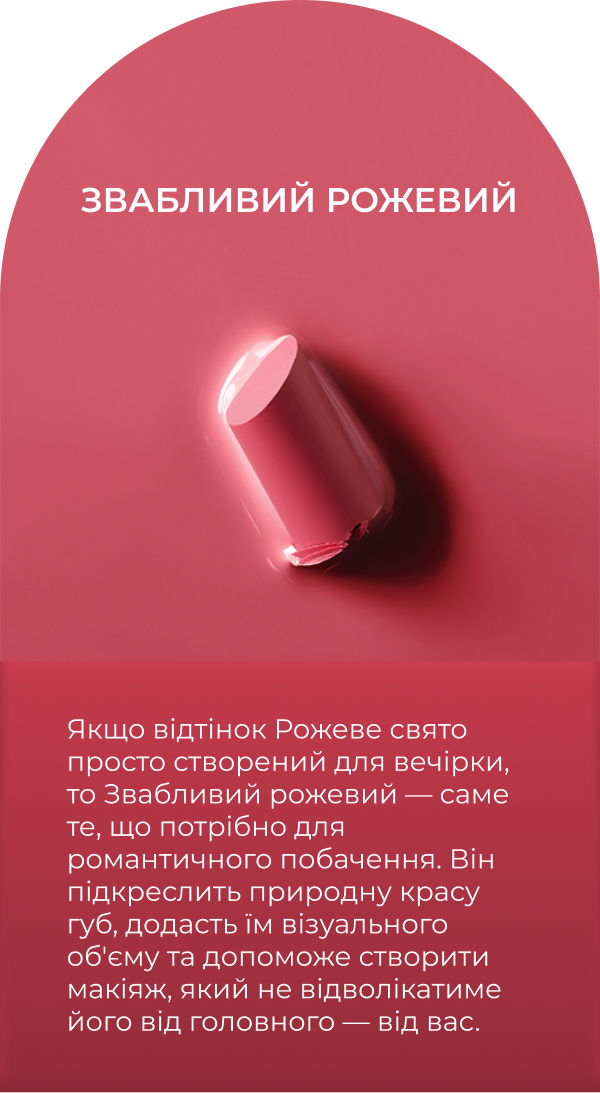 Якщо відтінок Рожеве свято просто створений для вечірки, то Звабливий рожевий — саме те, що потрібно для романтичного побачення. Він підкреслить природну красу губ, додасть їм візуального об'єму та допоможе створити макіяж, який не відволікатиме його від головного — від вас.