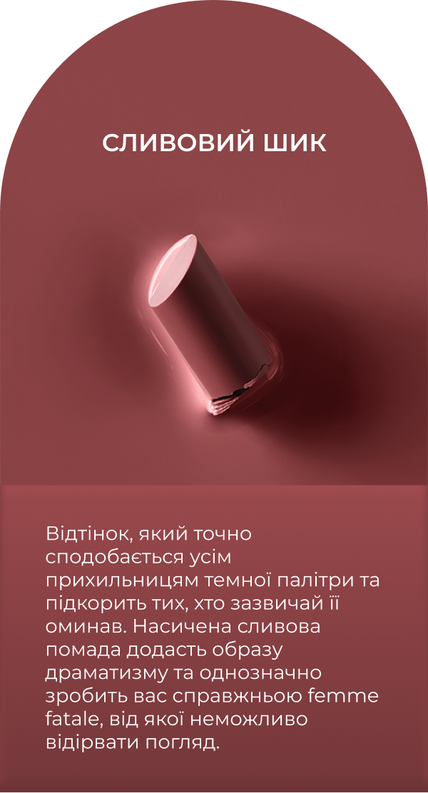 Відтінок, який точно сподобається усім прихильницям темної палітри та підкорить тих, хто зазвичай її оминав. Насичена сливова помада додасть образу драматизму та однозначно зробить вас справжньою femme fatale, від якої неможливо відірвати погляд.