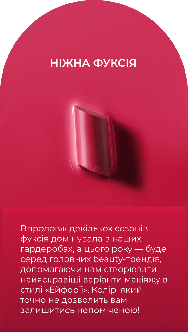 Впродовж декількох сезонів фуксія домінувала в наших гардеробах, а цього року — буде серед головних beauty-трендів, допомагаючи нам створювати найяскравіші варіанти макіяжу в стилі «Ейфорії». Колір, який точно не дозволить вам залишитись непоміченою!