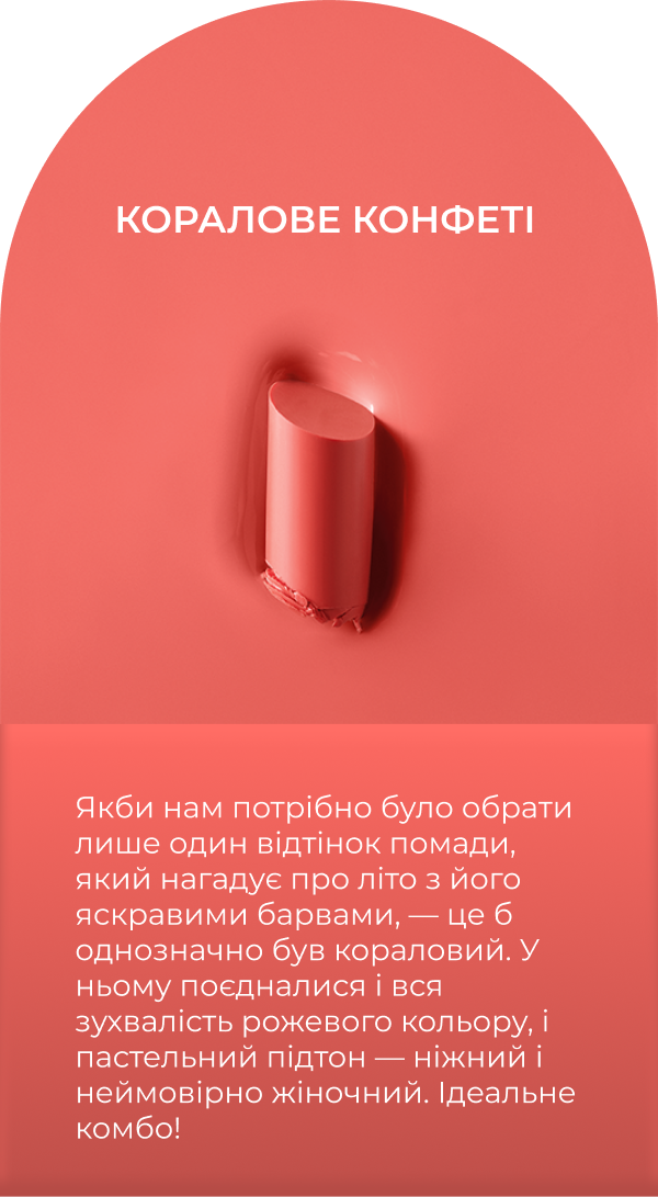 Якби нам потрібно було обрати лише один відтінок помади, який нагадує про літо з його яскравими барвами, — це б однозначно був кораловий. У ньому поєдналися і вся зухвалість рожевого кольору, і пастельний підтон — ніжний і неймовірно жіночний. Ідеальне комбо!