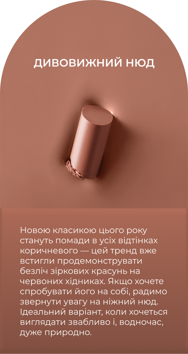 Новою класикою цього року стануть помади в усіх відтінках коричневого — цей тренд вже встигли продемонструвати безліч зіркових красунь на червоних хідниках. Якщо хочете спробувати його на собі, радимо звернути увагу на ніжний нюд. Ідеальний варіант, коли хочеться виглядати звабливо і, водночас, дуже природно.