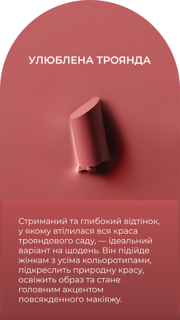 Стриманий та глибокий відтінок, у якому втілилася вся краса трояндового саду, — ідеальний варіант на щодень. Він підійде жінкам з усіма кольоротипами, підкреслить природну красу, освіжить образ та стане головним акцентом повсякденного макіяжу.