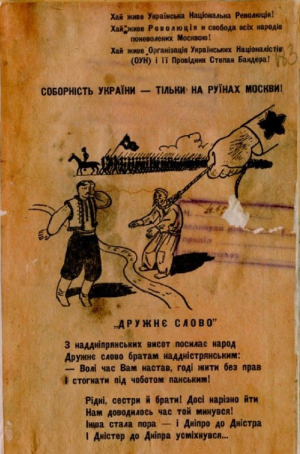 Волею Українського Народу Організація Українських Націоналістів під проводом Степана Бандери проголошує відновлення Української Держави, за яку поклали свої голови цілі покоління найкращих синів України.