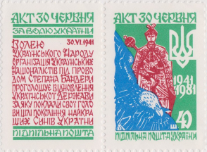 Марка Підпільної пошти України, випущена у 1981 році. Присвячена 40-й річниці Акту відновлення Української Держави Організацією Українських Націоналістів під проводом Степана Бандери 30 червня 1941 року у Львові.
