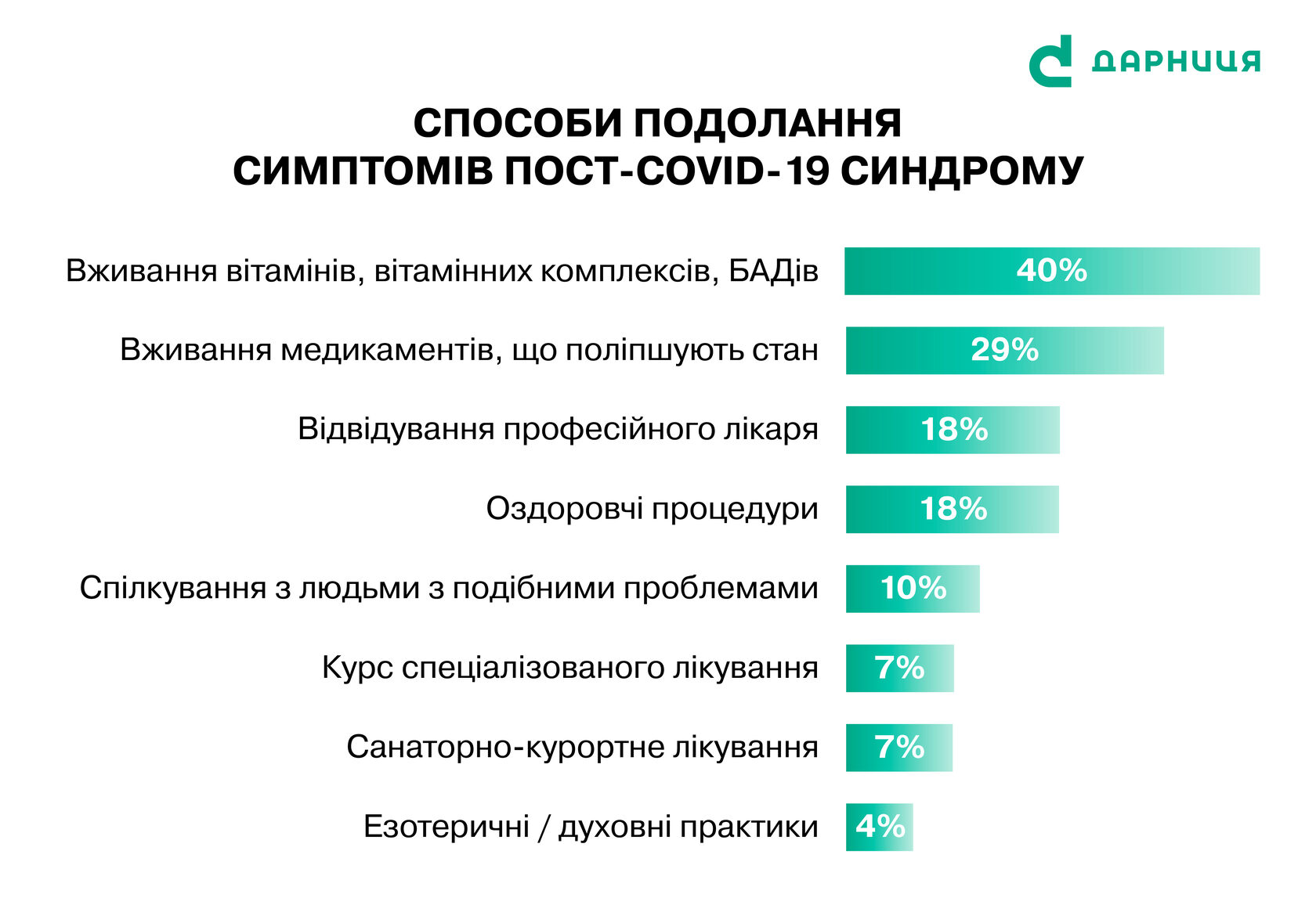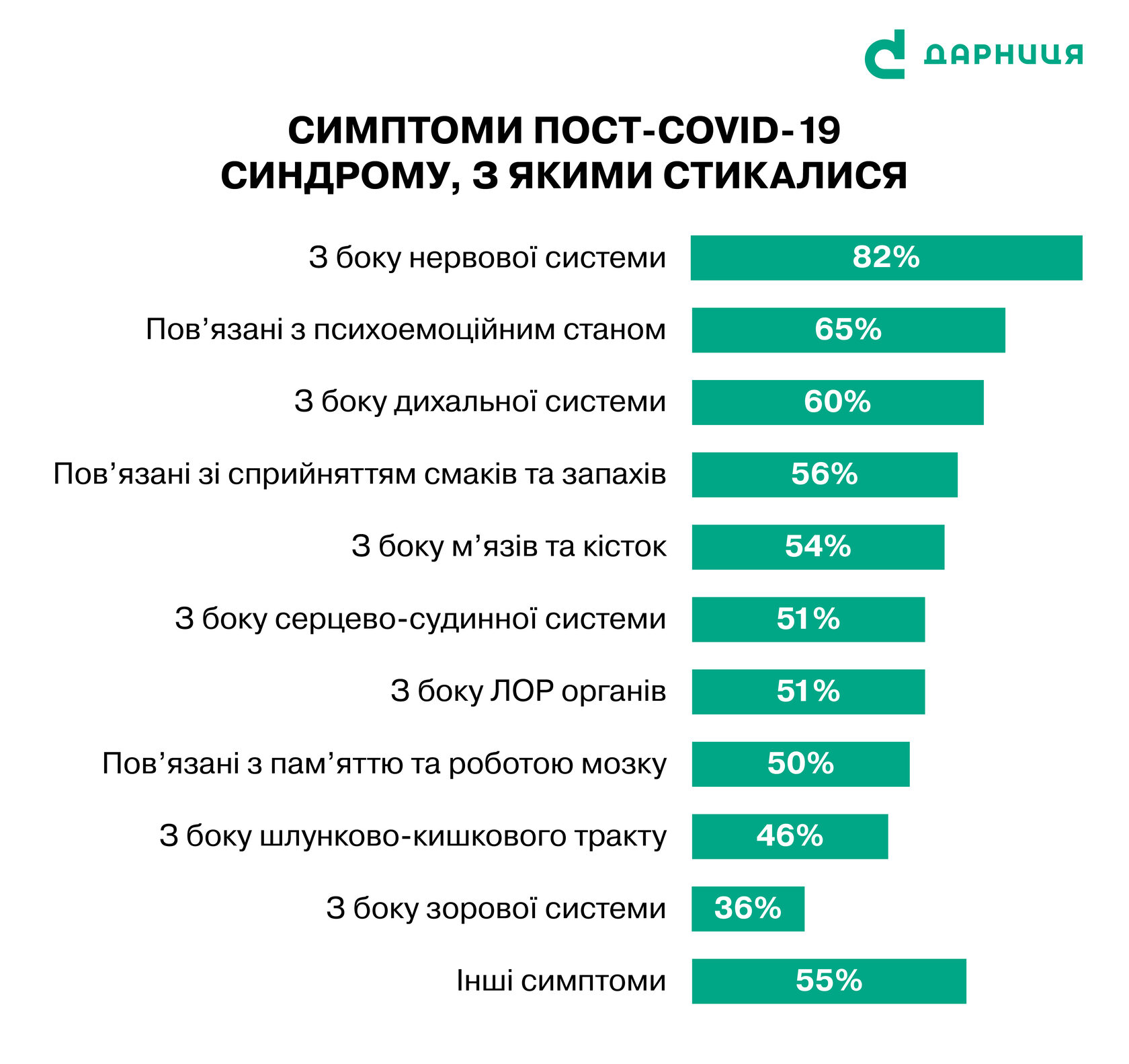 Згідно з даними багатьох міжнародних досліджень, утомлюваність розглядають як один із найпоширеніших проявів постковідного синдрому. Це також продемонструвала дослідницька компанія Gradus Researchℹ️, яка провела на замовлення фармацевтичної компанії «Дарниця» дослідження поширеності постковідних симптомів в Україні.