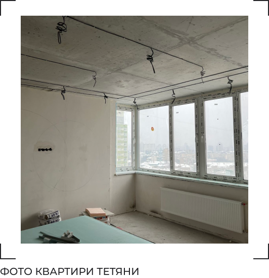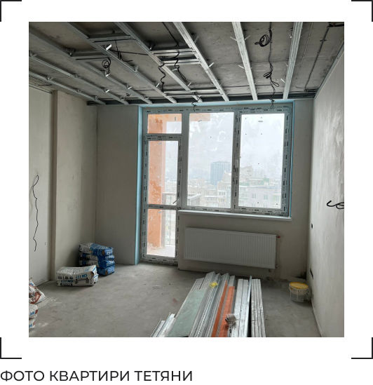 Квартира Тетяни знаходиться на 21 поверсі. Внаслідок удару її оселя була зруйнована на 70%. Ракета повністю знесла дитячу кімнату, пів спальні та пів вітальні. Зі стінами залишилися кухня, коридор та санвузли.