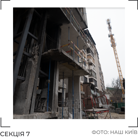 На двох секціях порається близько 50 робітників. Сьомий, восьмий та дев’ятий поверх 7-ї секції вже частково демонтували. Нині будівельники готуються до зведення нових конструкцій замість ушкоджених.