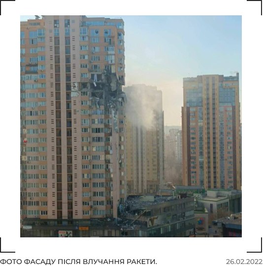 Було десь 7-10 хвилин на дев’яту ранку, коли неподалік від дитсадка впав уламок ракети. Для нас це було неочікувано. У моєму будинку найбільше постраждали перший та другий під’їзд. Там поранило людей, які в той момент перебували на кухні. Вони усі були в уламках скла, у крові. Четвертий під’їзд, де я проживаю, теж трохи зачепило. Тут повилітали всі вікна. Даху зовсім не стало.
