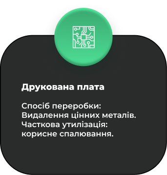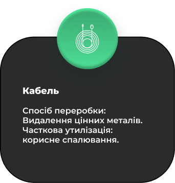 З кабелю та друкованої плати видаляють цінні метали та забезпечують безпечну утилізацію методом корисного спалювання.