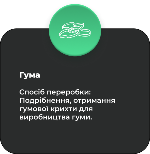 Спосіб переробки: Подрібнення, отримання гумової крихти для виробництва гуми.