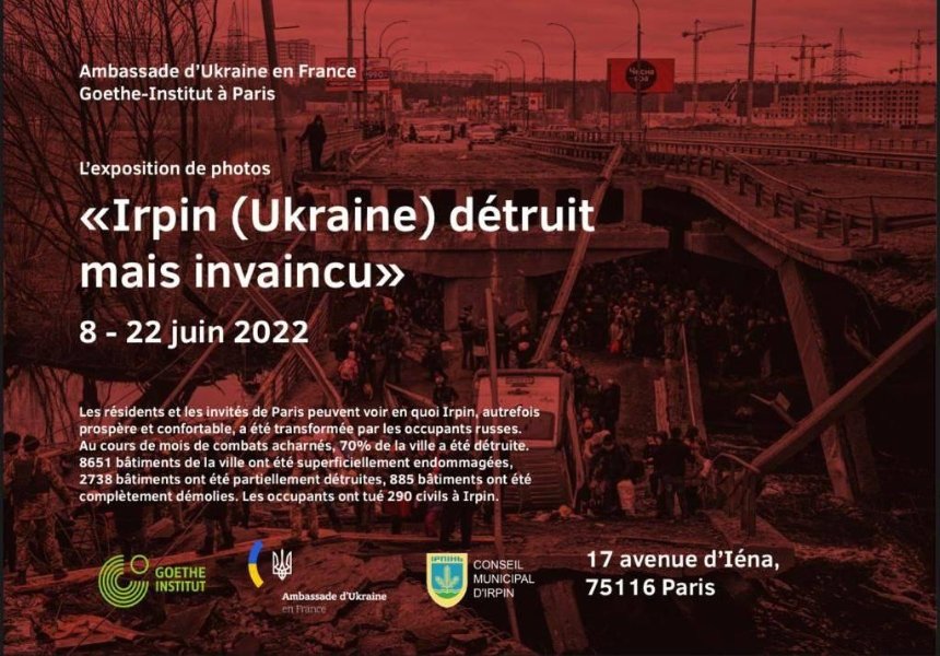 Впродовж тижня, з 8 червня, жителі та гості Парижу можуть на власні очі побачити, що полишили по собі російські окупанти на Київщині. У французькій столиці відкриють фотовиставку "Зруйнований, але нескорений Ірпінь", де крім світлин зруйнованого міста, будуть представлені також фото із свідченнями масових вбивств жителів Бучі.