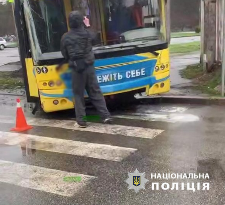 У Києві на проспекті Свободи сталася ДТП. Водію тролейбуса стало зле, він в'їхав у стовп. Коли медики надавали допомогу керманичу, місцеві хлопці розмалювали лобове скло тролейбуса заради забави.