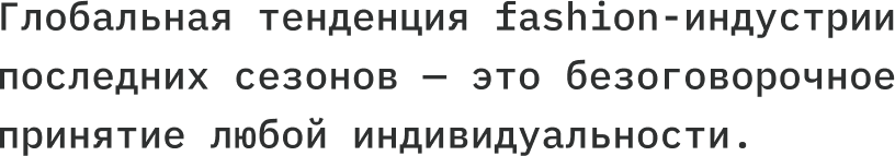 Глобальная тенденция fashion-индустрии последних сезонов - это безоговорочное принятие любой индивидуальности.